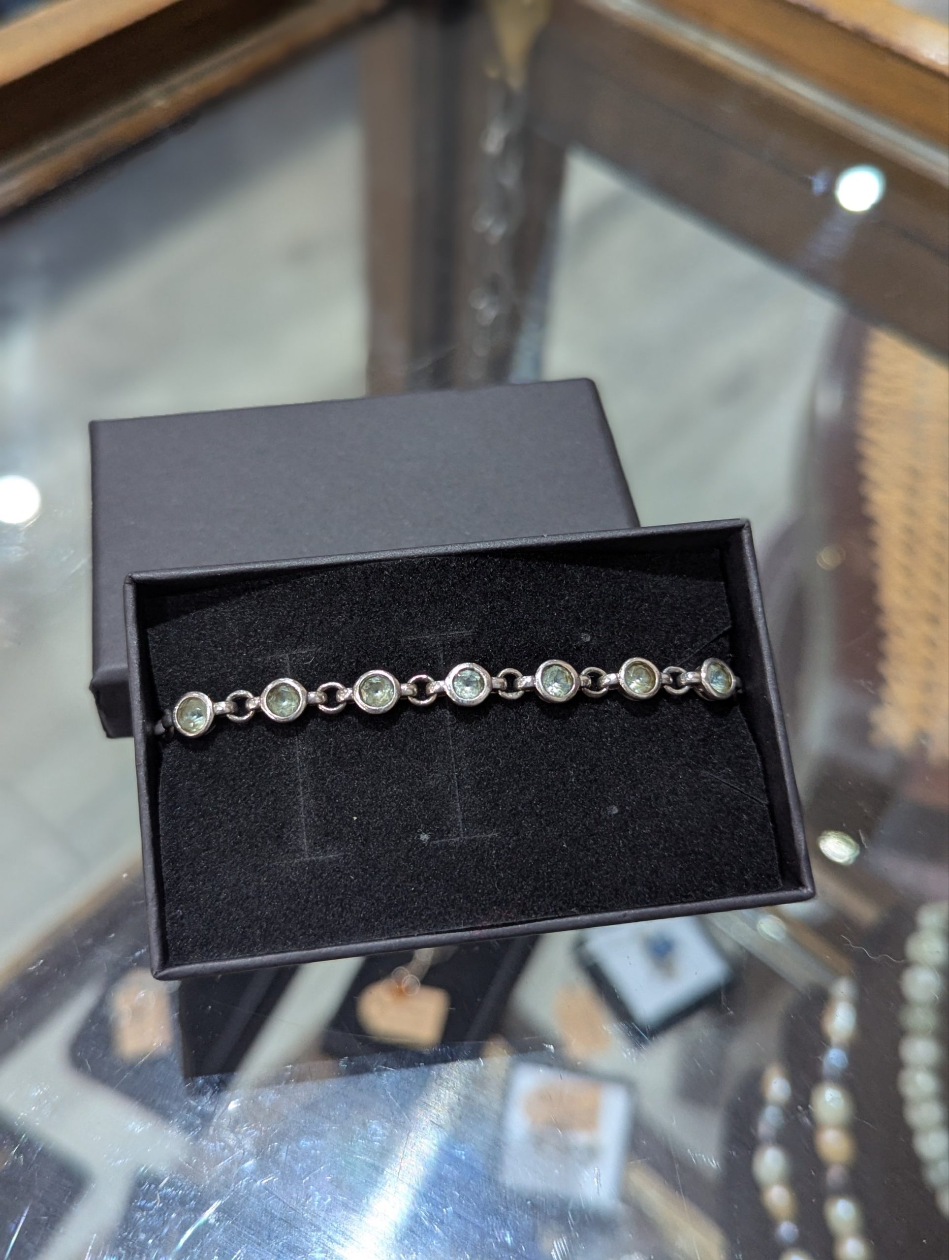 Gorgeous vintage-style bracelet featuring light blue topaz set in sterling silver and a secure lobster clasp enclosure. Elegant, timeless, and perfect for any occasion!