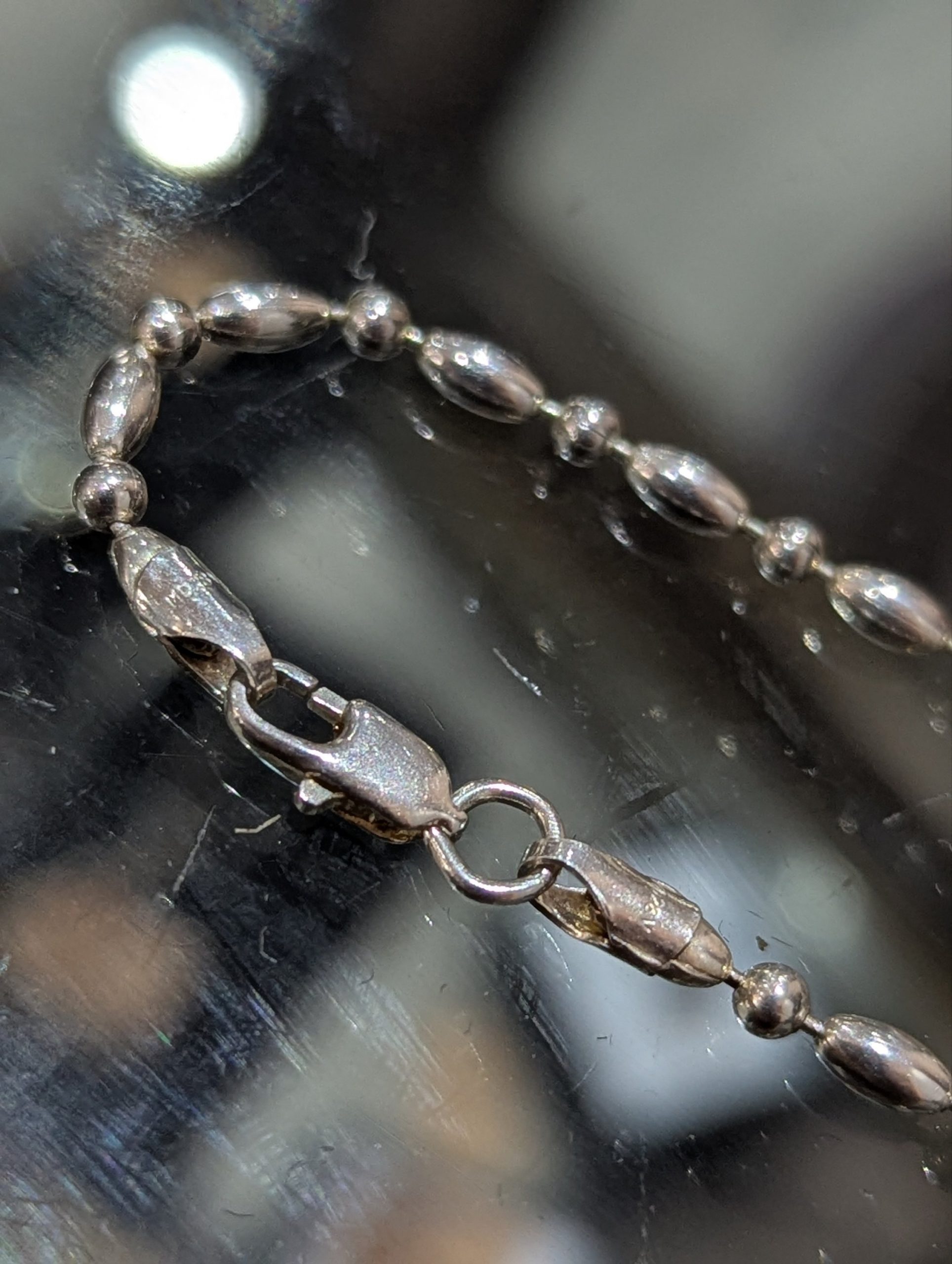 Gorgeous delicate bracelet in sterling silver with a continuous strand of small silver oval beads and a secure lobster clasp enclosure. Ideal for layering and everyday wear ~ £18.00