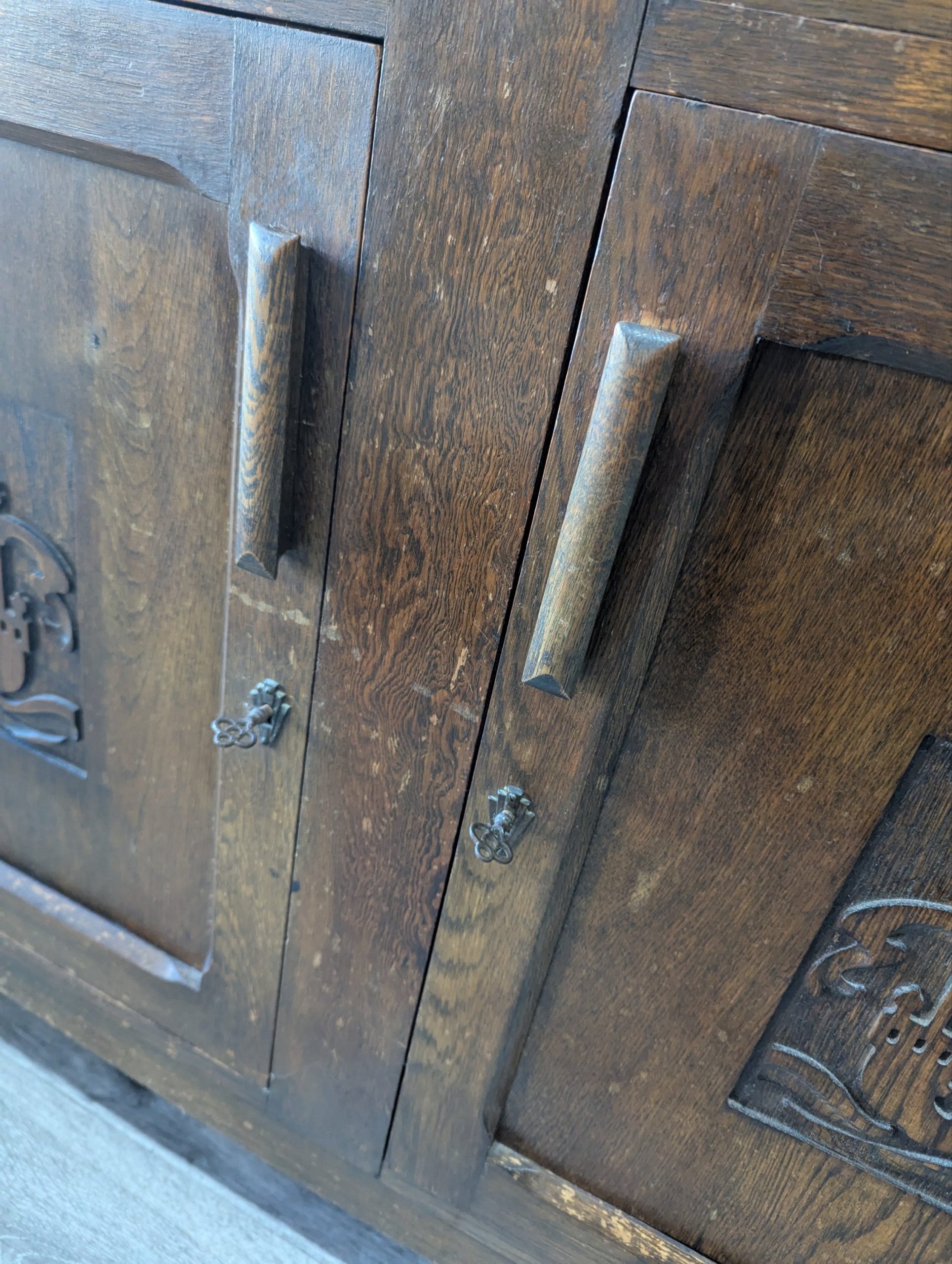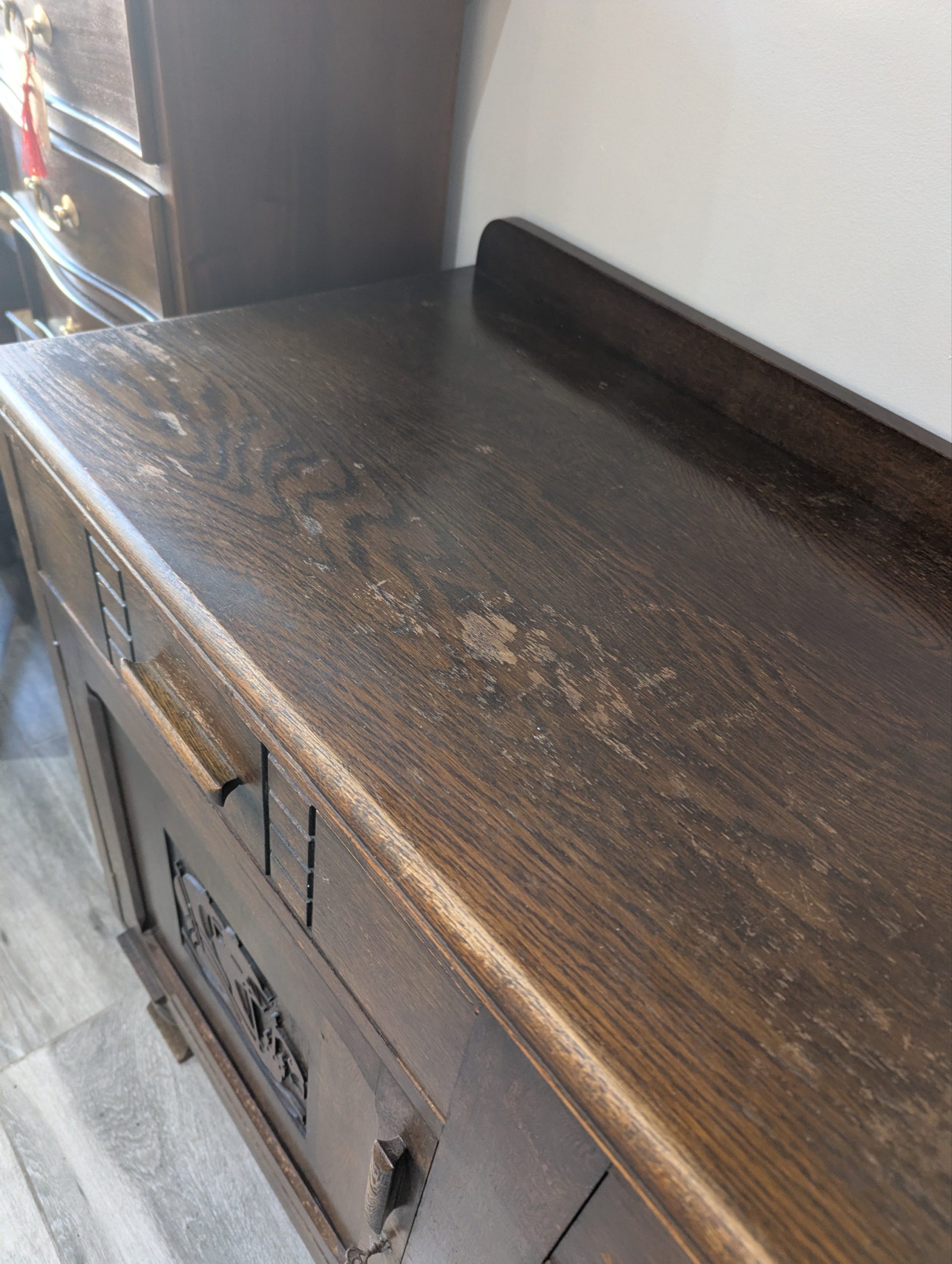 Art deco sideboard with hand-carved ship to the centre of each door. Solid and sturdy with tons of character — features two drawers and two cabinets (with working lock and keys) for storage. Perfect for a dining room, hallway, or cozy vintage-inspired space. ✨
