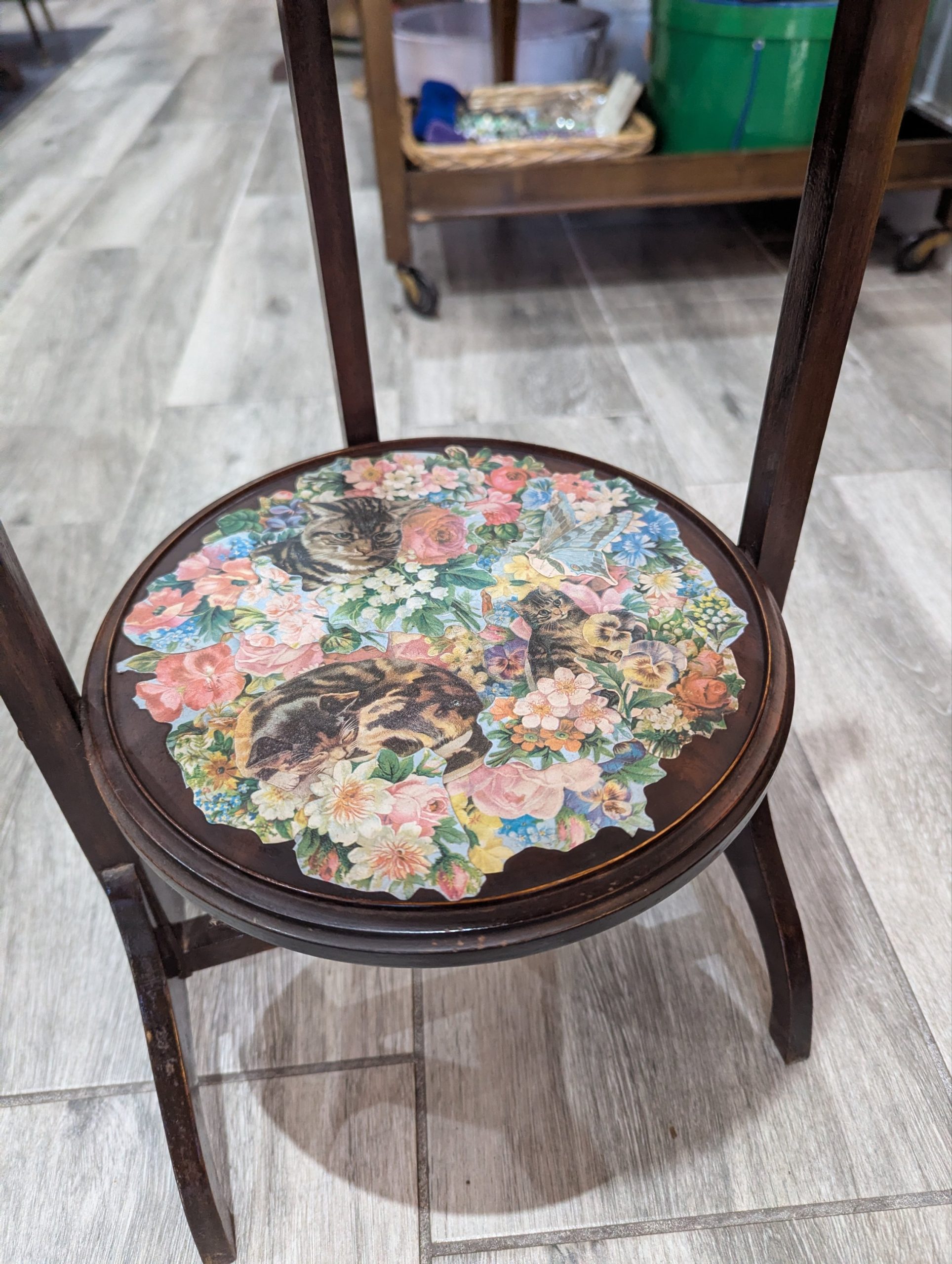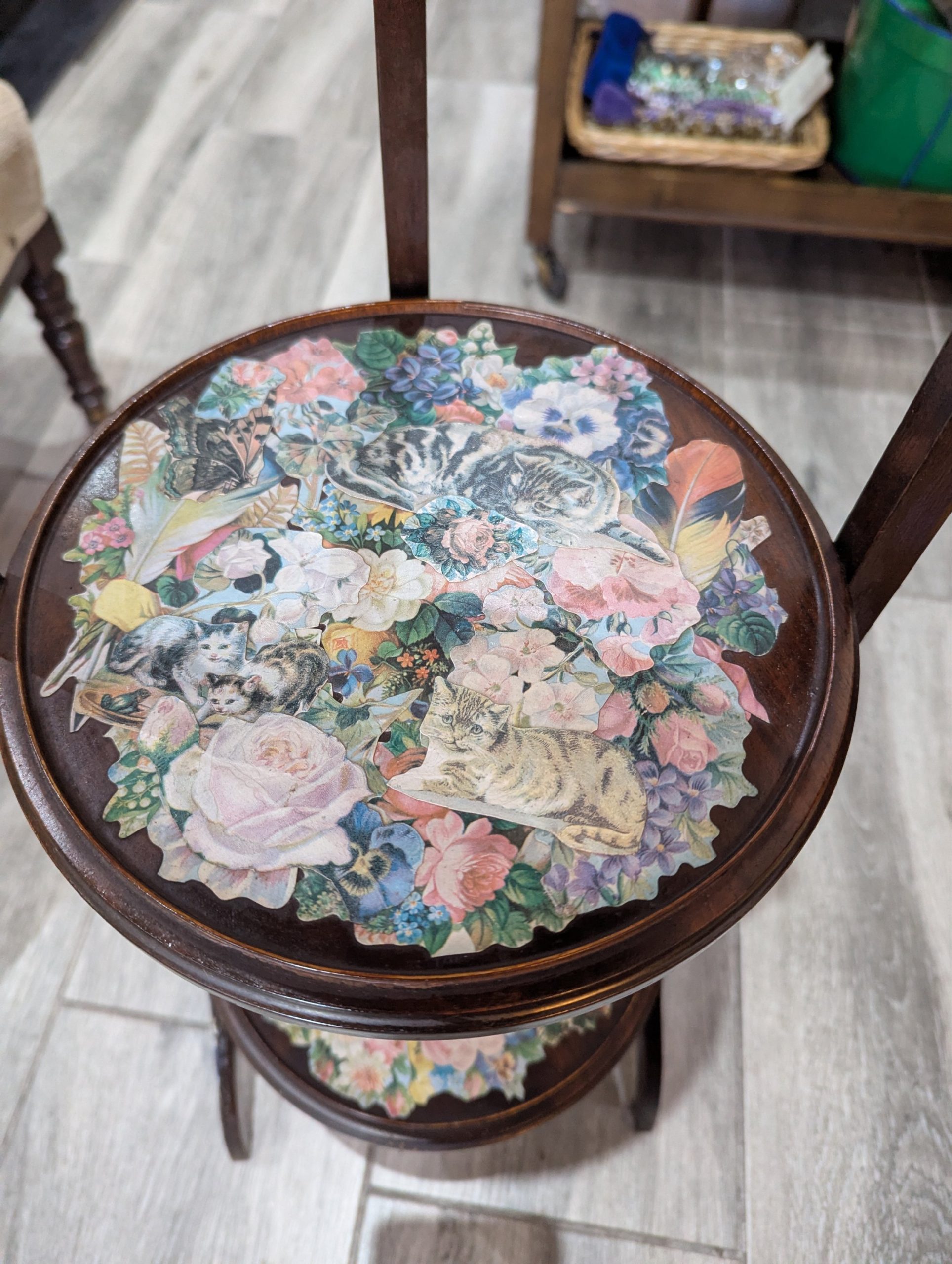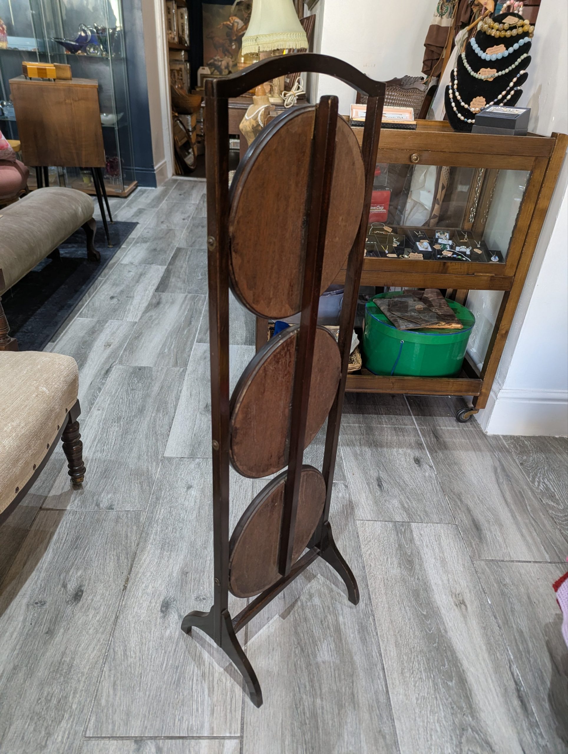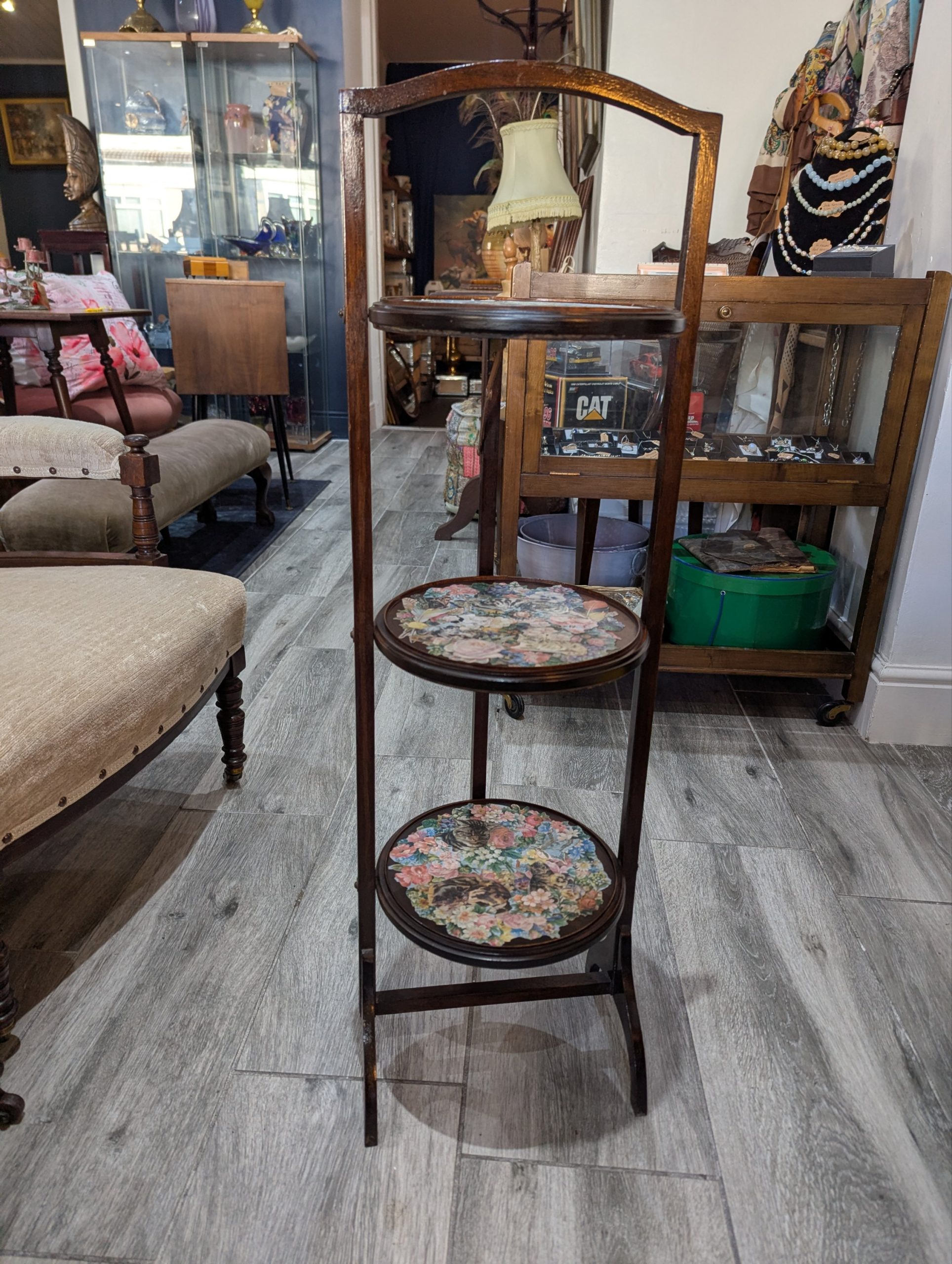 Beautiful vintage wooden 3-tier cake stand with lovely decoupaged plates. Folds flat for easy storage when not in use. Perfect for afternoon tea, cake displays, or as a charming plant or ornament stand ~ £24.00