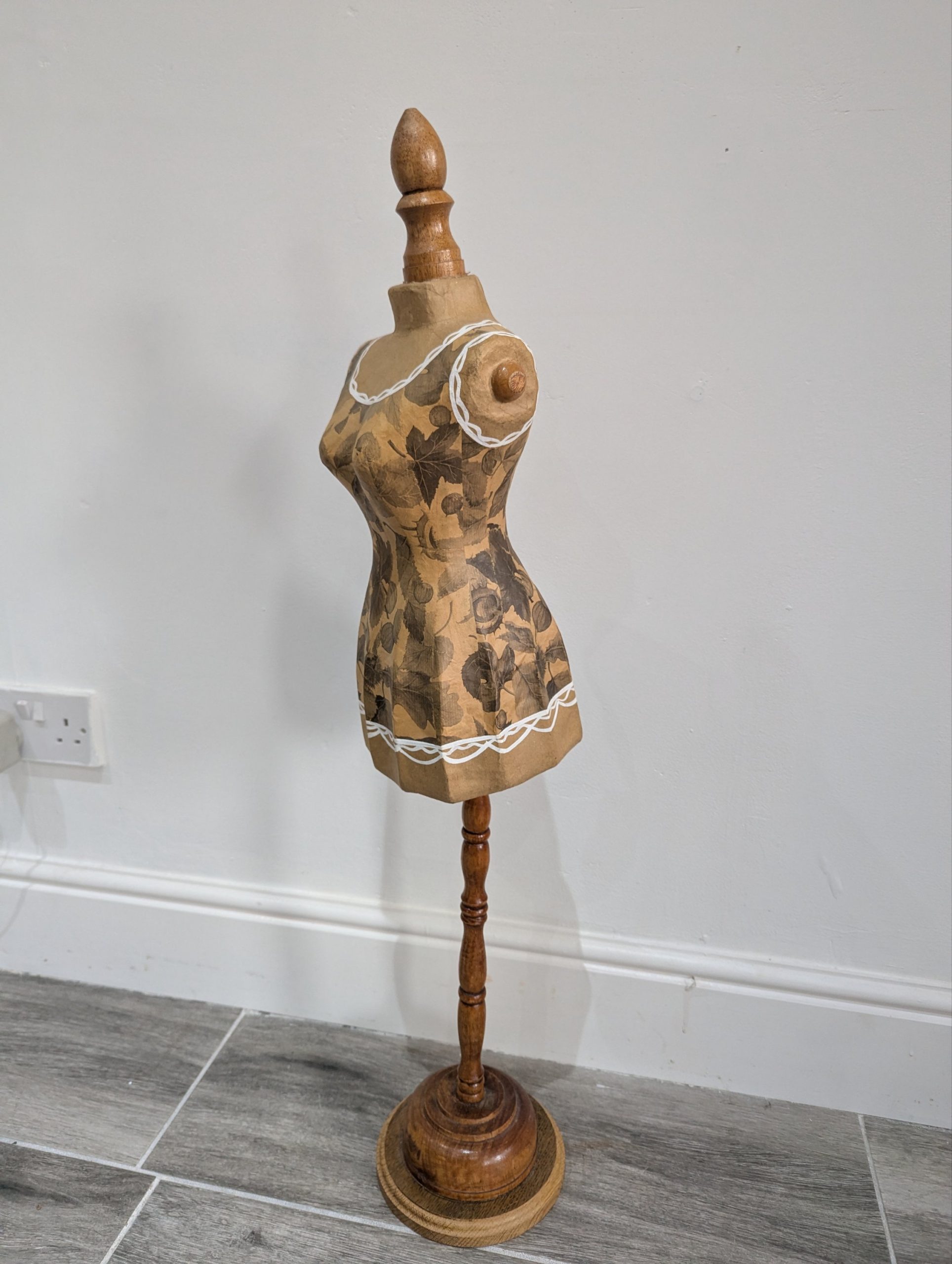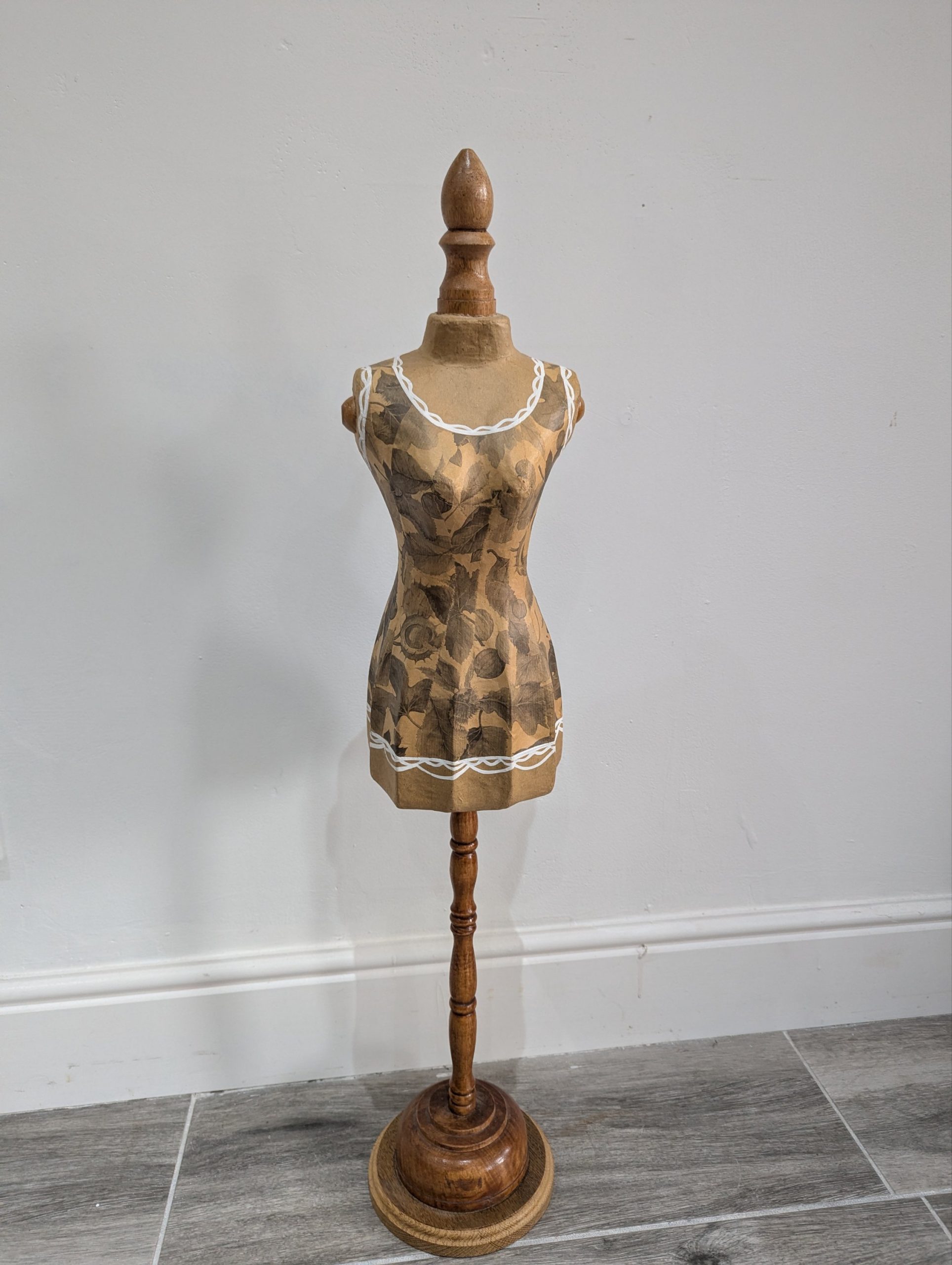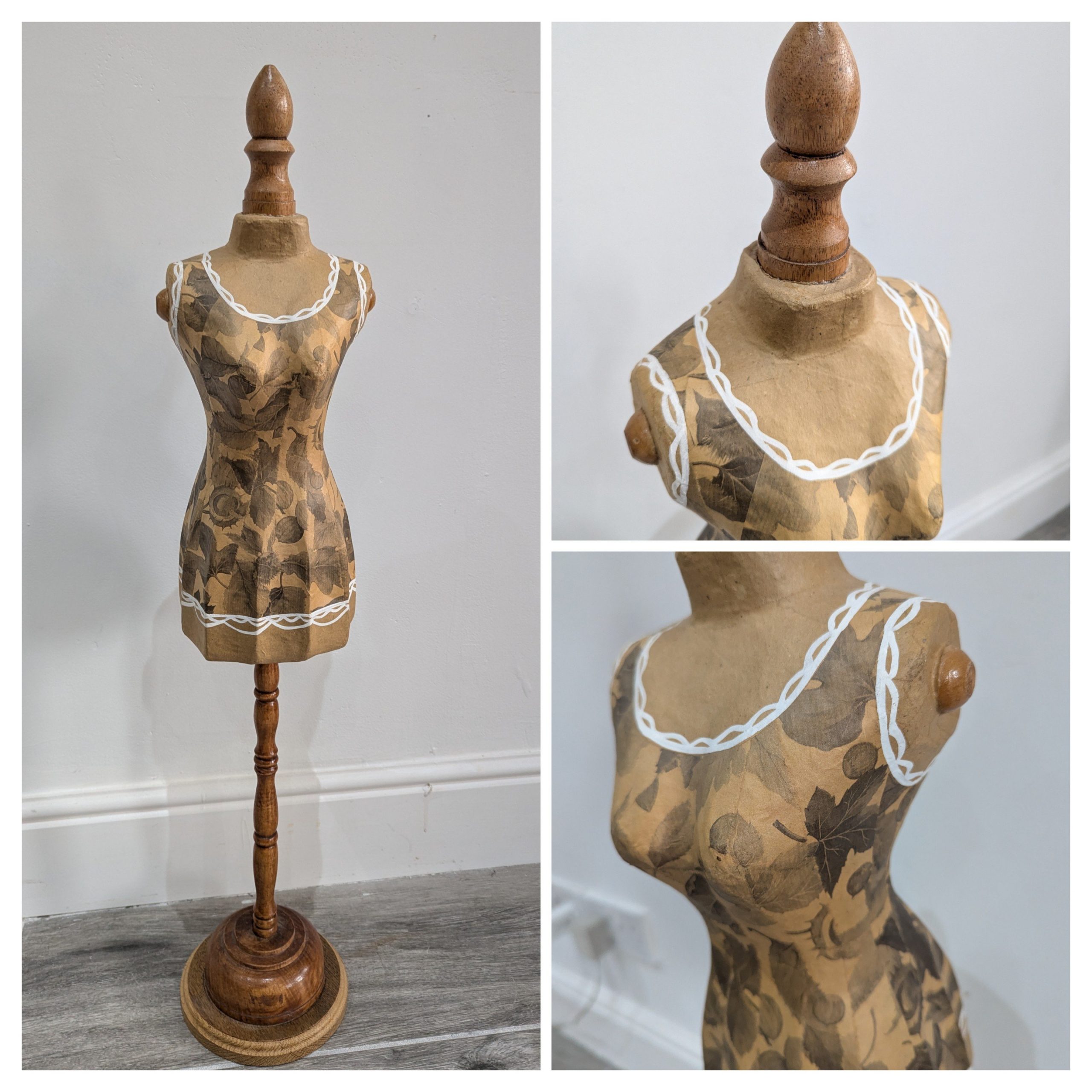 Add a touch of vintage charm to your home décor or boutique display with this beautifully crafted decorative mannequin. The torso features an elegant paper mache floral patterned finish with delicate white painted trim details, mounted on a turned wooden stand with a sturdy circular base. Perfect as a decor piece, jewellery stand, or for displaying scarves and accessories in a boutique or dressing room ~ £28.00