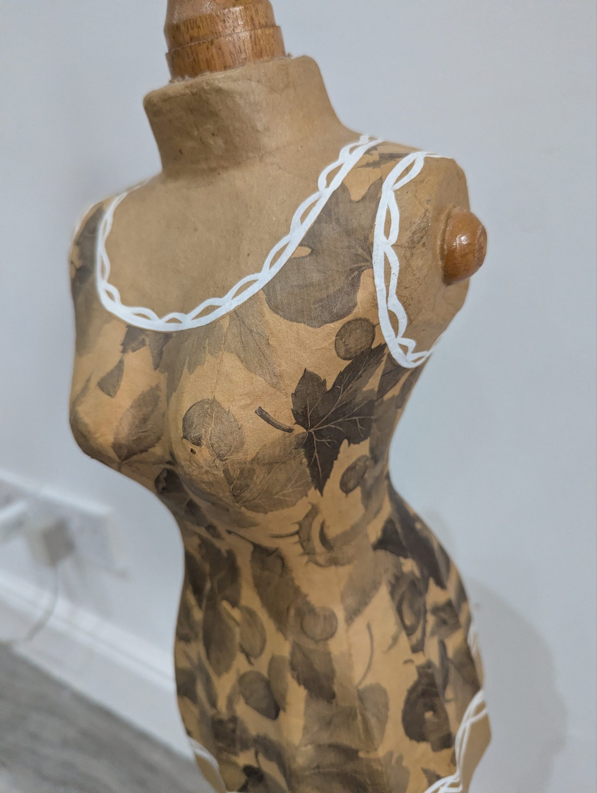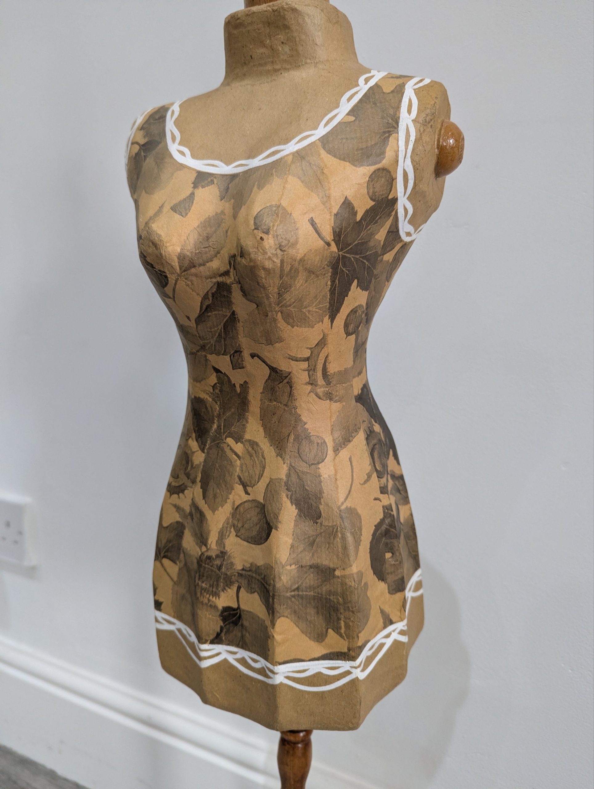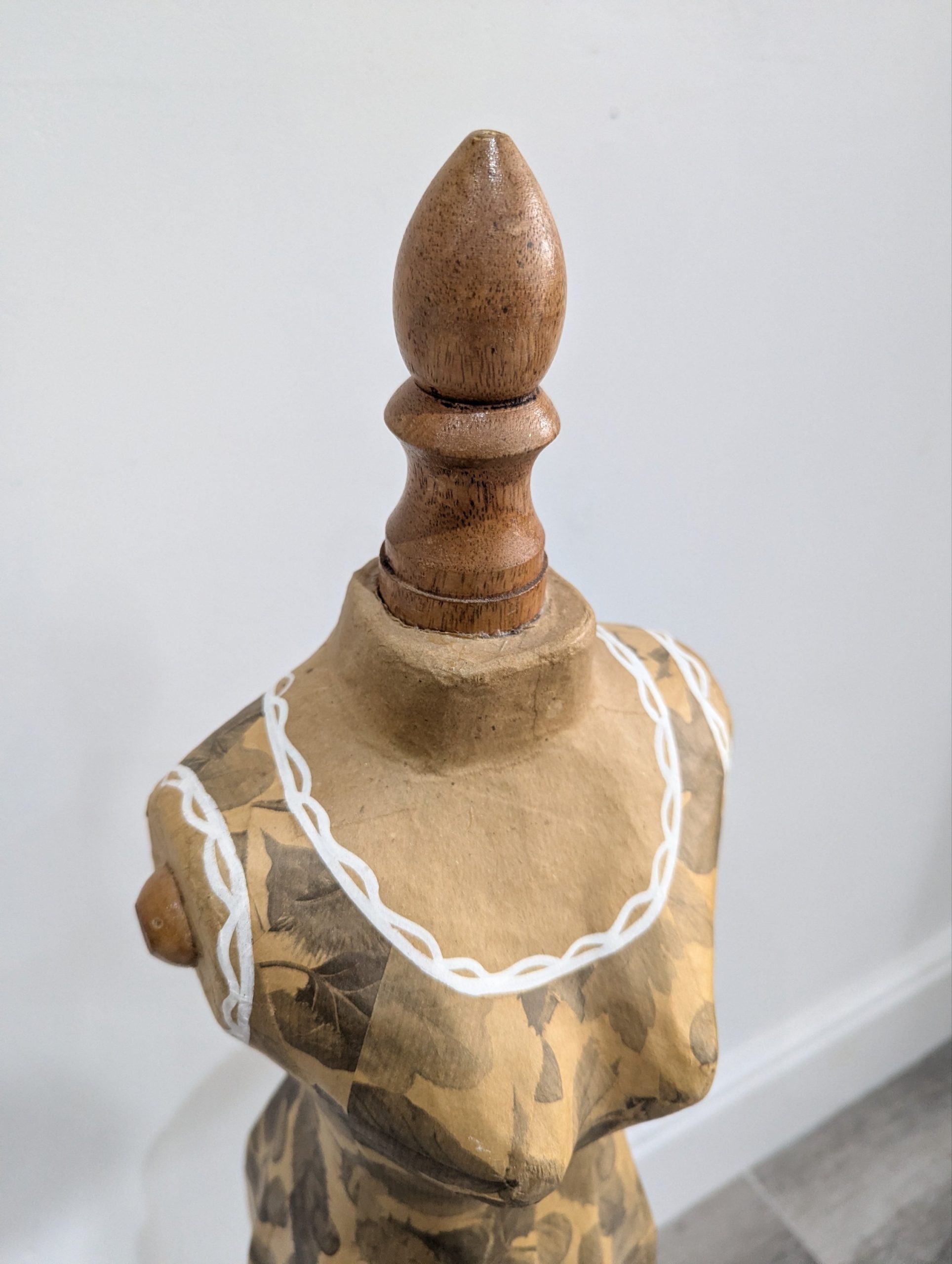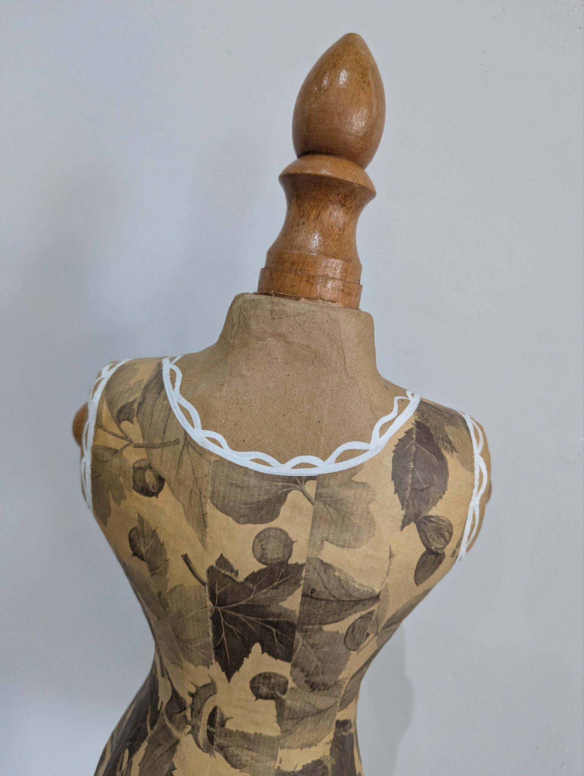 Add a touch of vintage charm to your home décor or boutique display with this beautifully crafted decorative mannequin. The torso features an elegant paper mache floral patterned finish with delicate white painted trim details, mounted on a turned wooden stand with a sturdy circular base. Perfect as a decor piece, jewellery stand, or for displaying scarves and accessories in a boutique or dressing room ~ £28.00