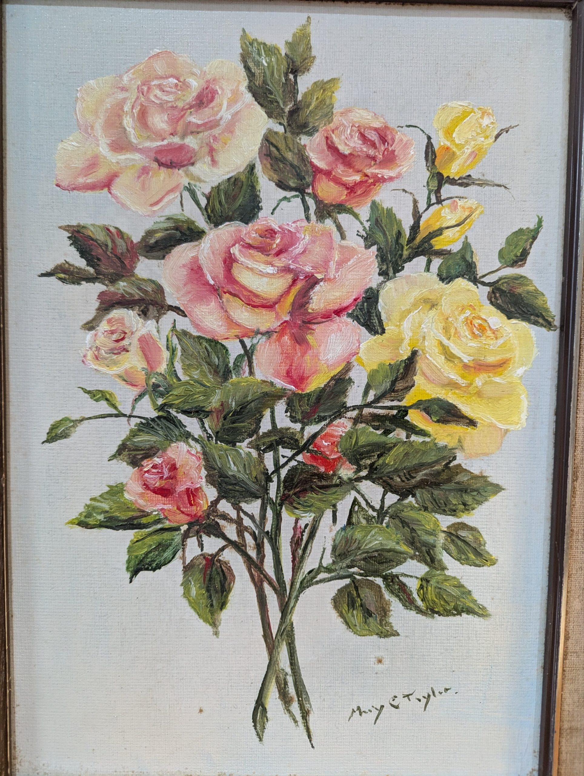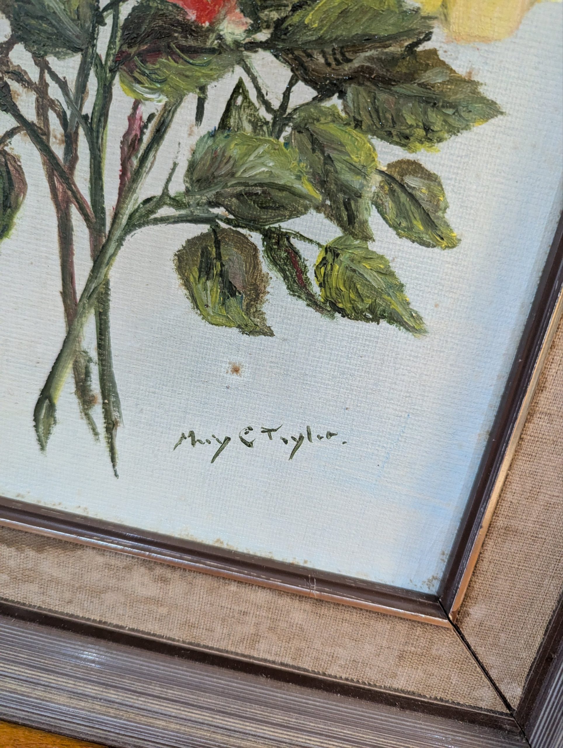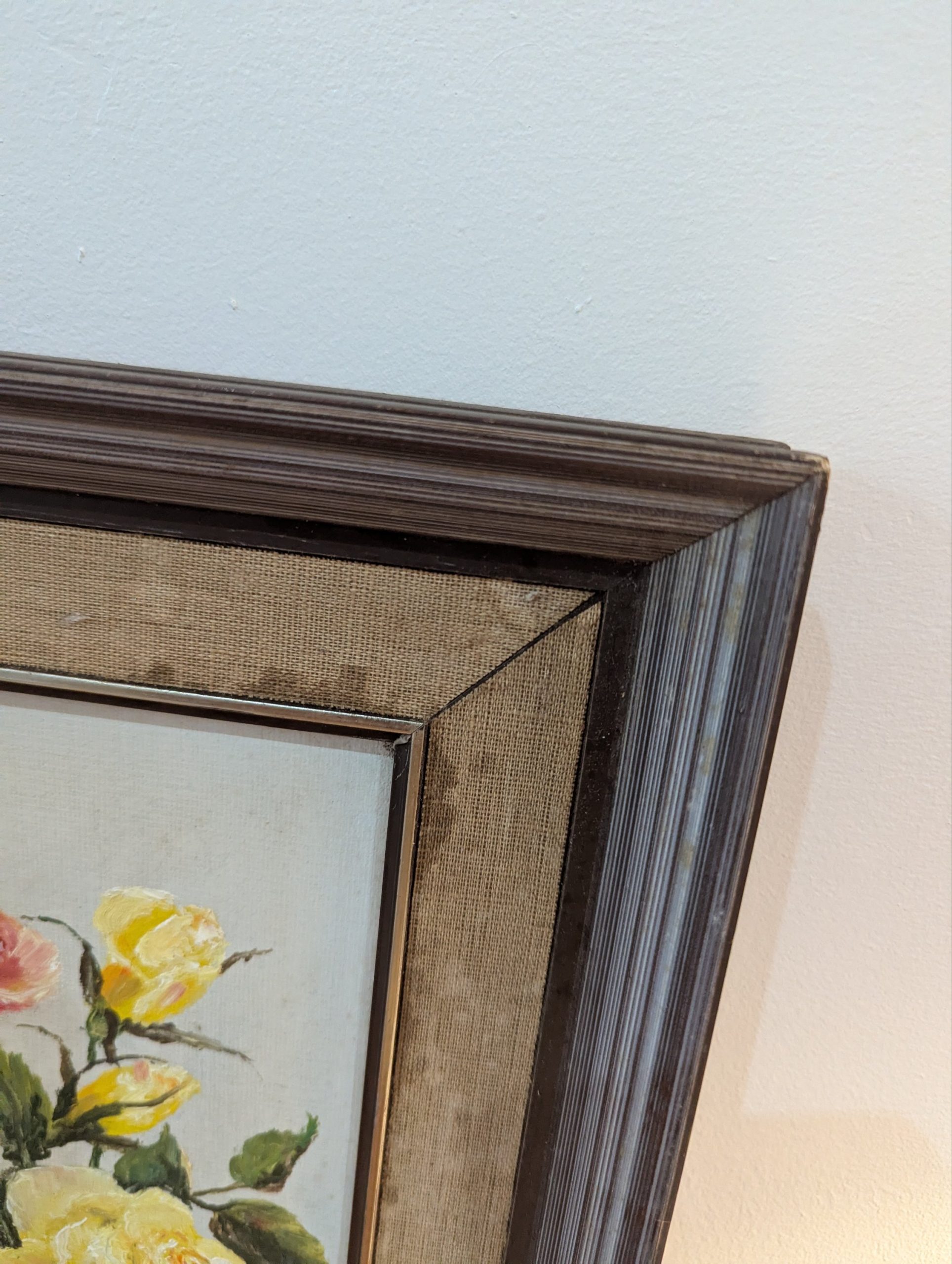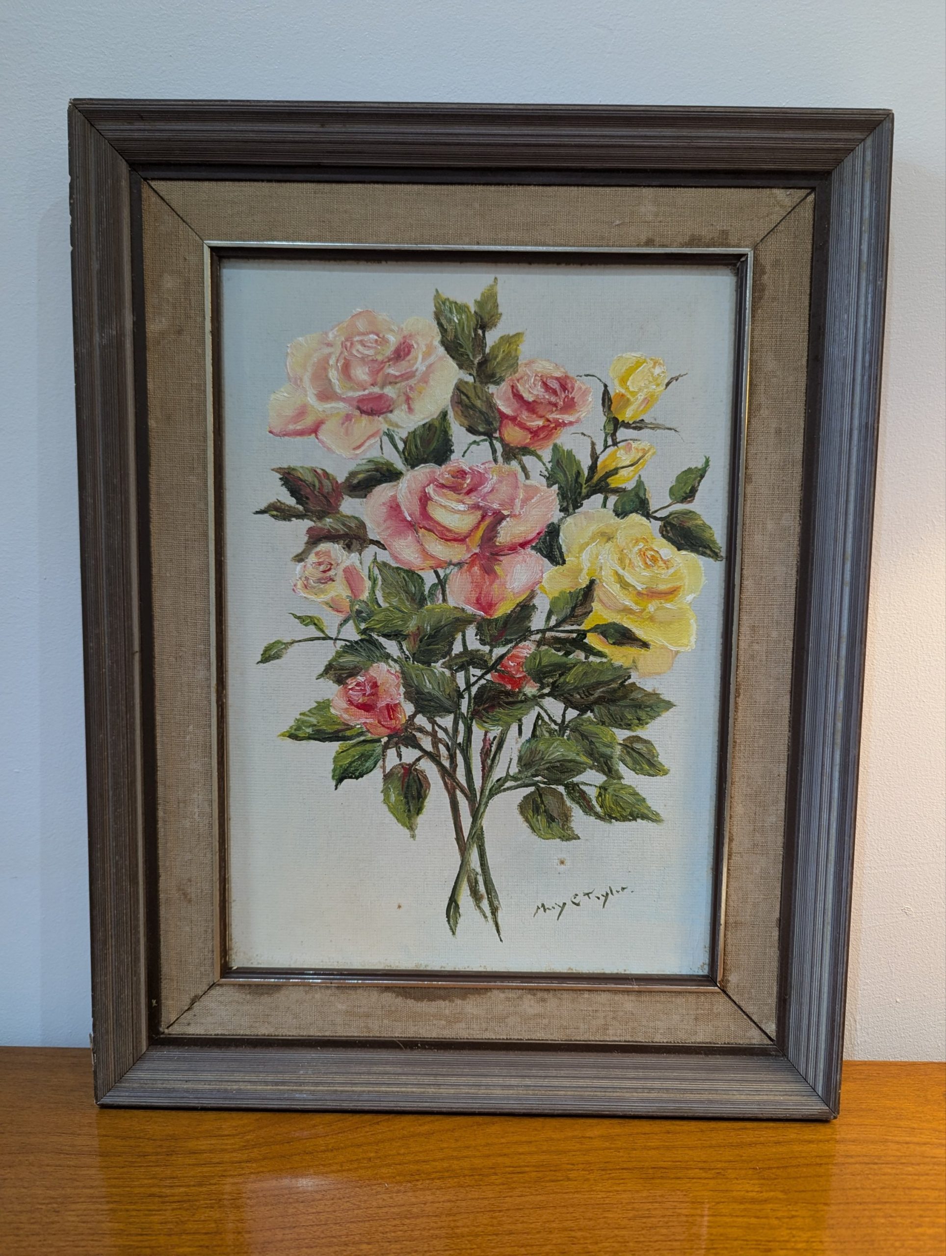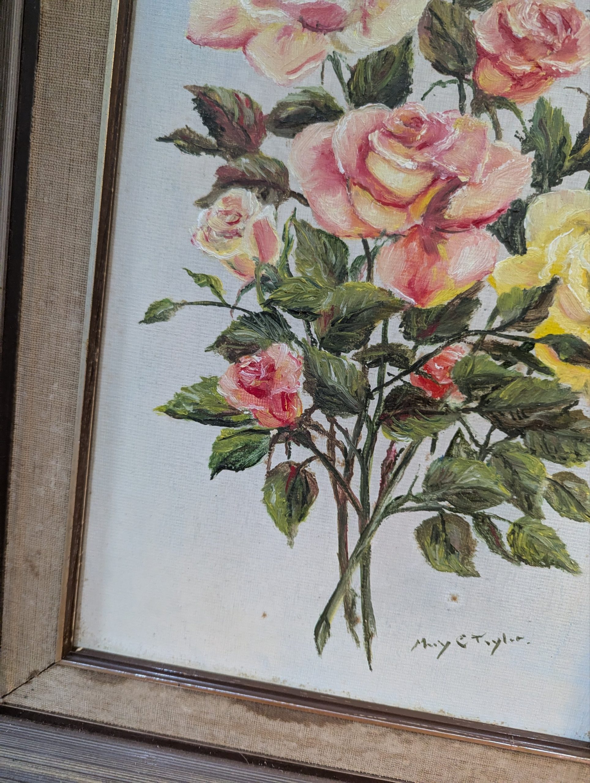 Featuring a bouquet of pink and yellow roses. The artwork is beautifully detailed, capturing the soft texture and natural grace of blooming flowers. Signed by artist